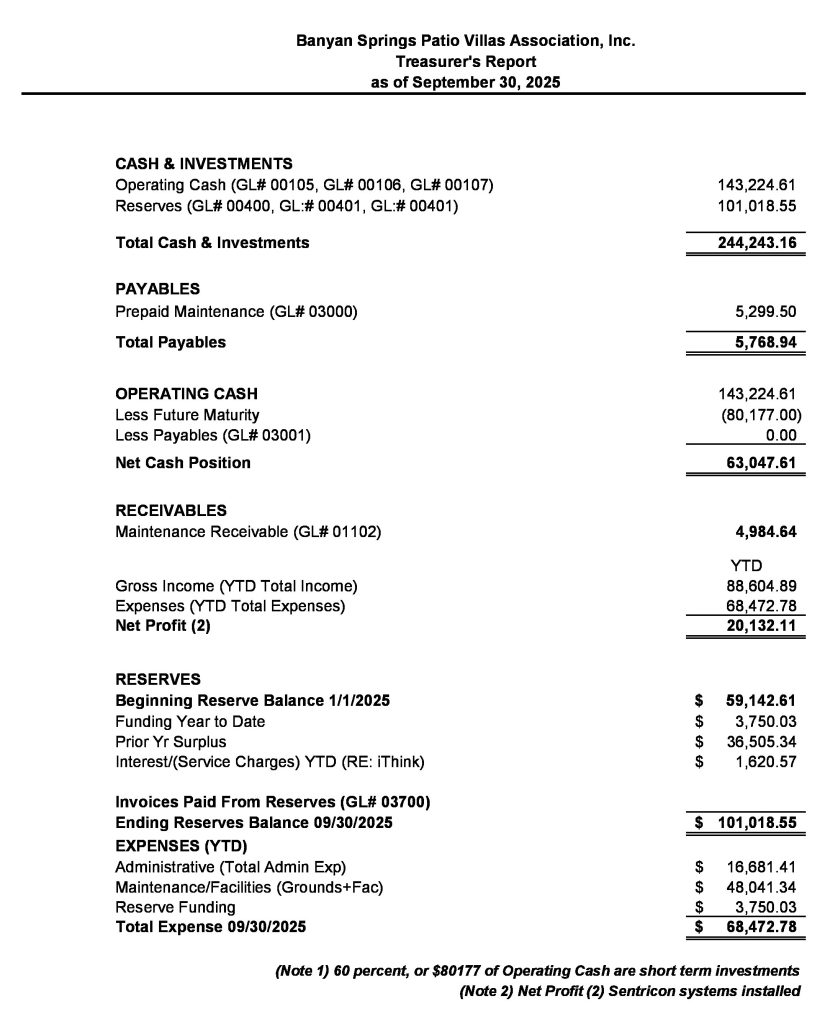 Treasurers Report Sept. 30, 2025